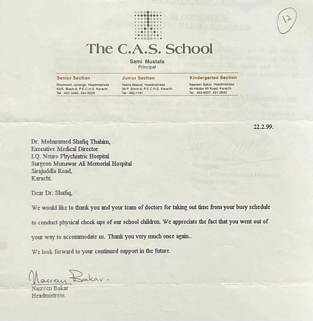 In 1999, the medical teams from IQ and Dr. Aisha’s Health Vision Hospital (then known as Surgeon Munawar Ali Memorial Hospital) extended their care beyond clinical settings, supporting one of Karachi’s leading educational institutions: The C.A.S. School.